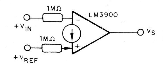 The amplifiers of the LM3900 can also be used as voltage comparators in several projects. The first circuit we present, shown in the figure, is for positive input voltages. For a satisfactory operation of this circuit, the reference voltage (Vref) must be greater than VBE, and the input resistor must be large enough, so that the current does not exceed 200 uA, whatever the voltage used.