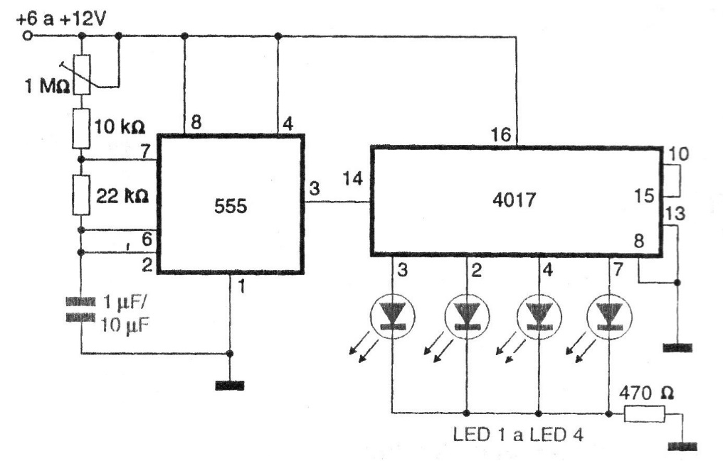 This system of sequential LEDs has its speed adjusted in a 1 M ohm potentiometer and this speed basically depends on the capacitor connected to pins 2 and 6 of the 555. The supply voltage of the circuit can be between 6 and 12 V and the resistor of 470 ohms determines the brightness of the LEDs.