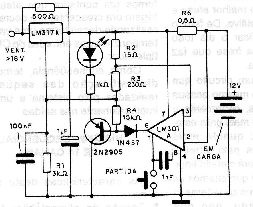 This battery charger is suggested by National and has a switch that turns it off when the battery is fully charged. Initially, the charging current is limited to 2 A. As the voltage in the battery rises, the charging current decreases until, when its value reaches 150 mA, the circuit switches, ending the charging process. An LED indicates when this occurs. With fully discharged batteries, the start is automatic. With partially discharged batteries, the starter must be pressed. The charging voltage is 14.5 V and the LM317 K needs to be mounted on a good heat radiator.
