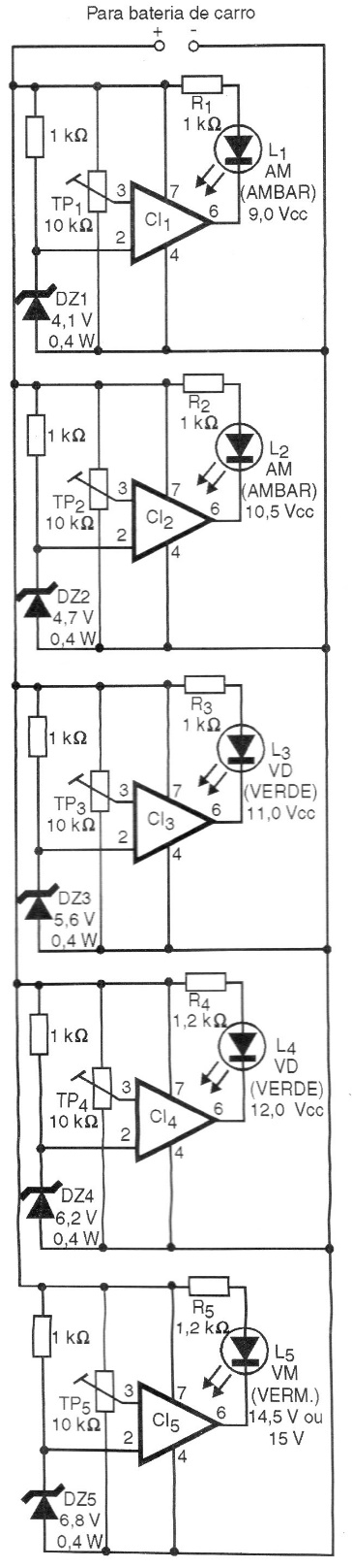 This circuit was found in a 1998 documentation. It makes use of 741 or other operational amplifiers configured as voltage comparators. The voltages of each LED lighting are determined by the corresponding zener diodes. The circuit is used to monitor stepped voltages up to 15 V, and the values depend only on the zeners and the settings.