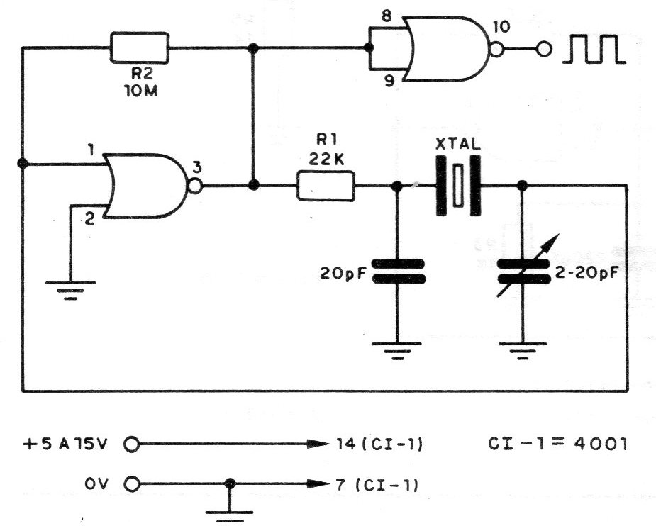 For the C-MOS digital logic we have the circuit shown in the figure. Its basis is the integrated circuit 4001, which can operate at frequencies up to SM Hz approximately. The adjustment of the operating point is made in the trimmer and the components C1 and R1 must be adjusted according to the frequency and type of crystal, to oscillate. The output signal is also square, and the supply can be made with voltages between 5 and 15 V. Observe the supply points of the integrated in pins 14 and 7 in the diagram.