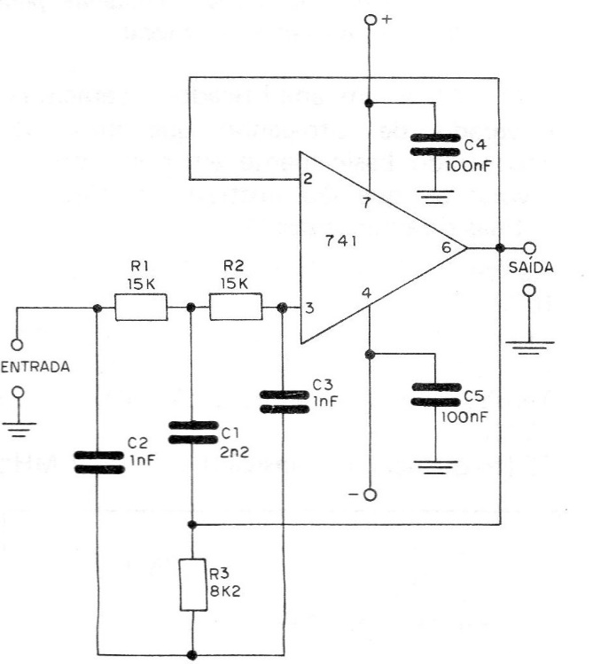 Frequencies other than the one for which this filter was calculated can pass with a unit gain to the next step. The central frequency signals do not pass at all. A suggestion for applying this circuit and for filtering the snoring of the 60 Hz power supply network, which can be totally blocked without appearing in audio circuits. The circuit, which uses a 741 only, is shown fully in the figure. The circuit is based on a double T that is tuned to the frequency to be blocked. As in the previous application example, there must be a defined relationship between the components of the double T. This relationship is as follows: