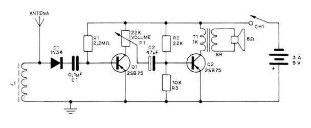 To receive the medium wave stations in your locality, we have here a receiver that, despite its simplicity, with the use of a good antenna, can excite a speaker. The author, to "save" components, suggests that the tuning is done by moving the core of the coil, but this operation will be facilitated by the connection of a variable capacitor in parallel with it. This coil consists of approximately 80 turns of wire enameled 28 or 30, on a ferrite rod at least 10 cm long The detector diode can be of any type for general use, such as 1N34, while in the original project the author used old PNP germanium transistors, such as the 2SB75, 2SB175, AC128 or BC178, which can be used from unused transistor radios.