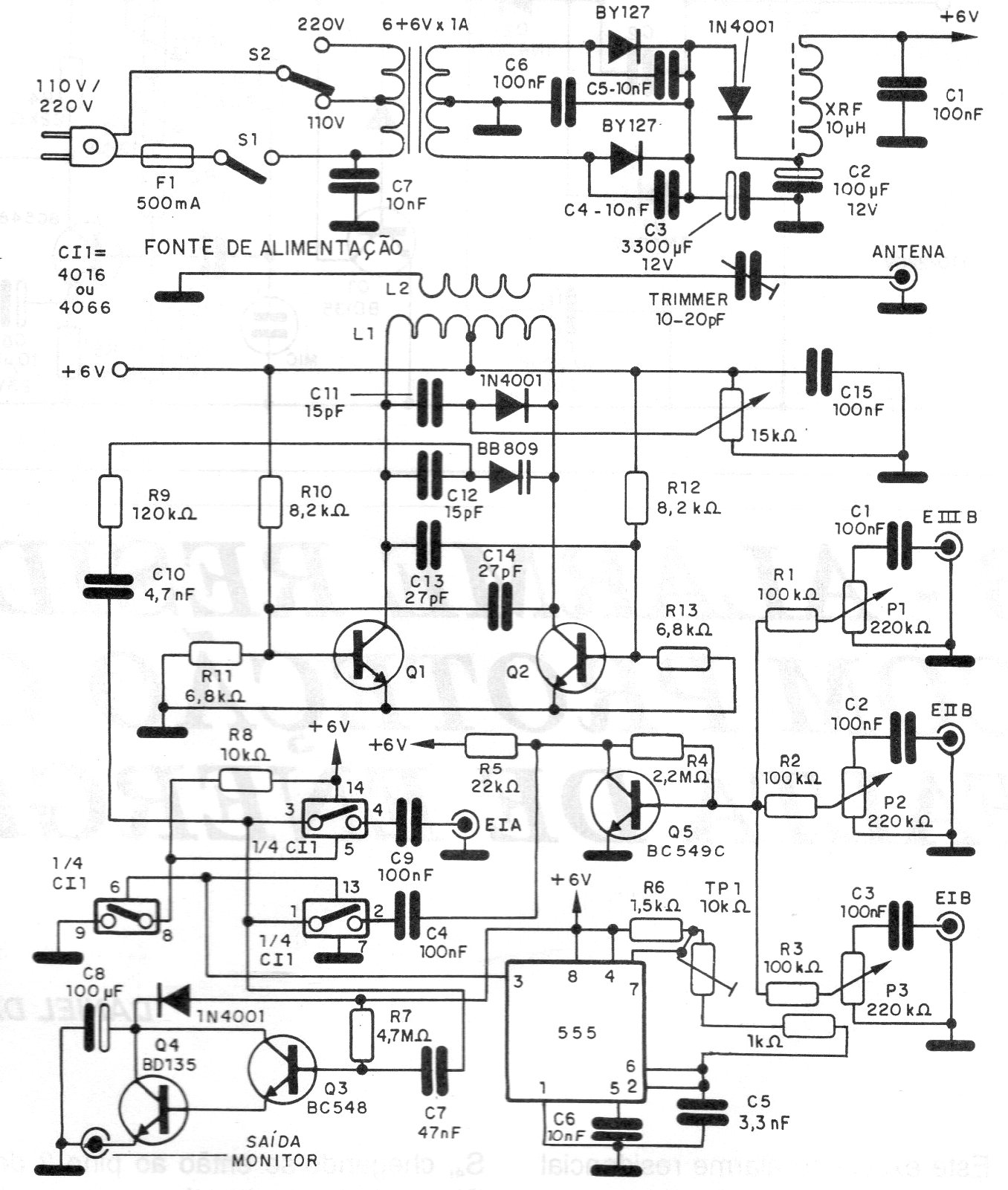 This circuit is from 1995 documentation, with Q1 and Q2 of type 2N2218 or higher power. L1 has 3 + 3 turns of wire 22 or 24 in the form of 1 cm without core and L2 has 4 turns linked in L1. The font is included, and care must be taken with the layout to avoid noise. The various adjustments are to obtain greater power, correct frequency of the pilot signal and modulation.