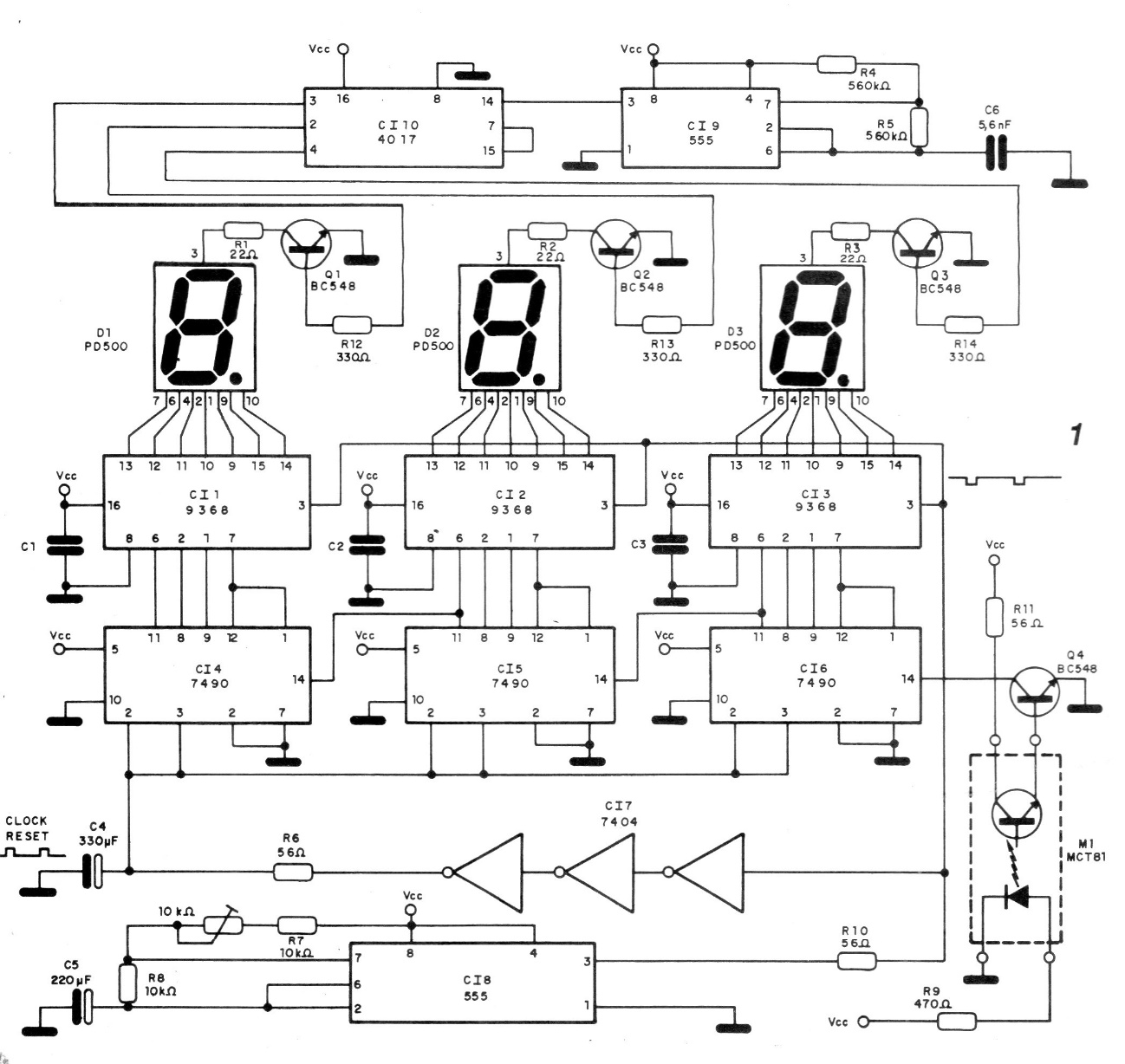 This circuit was found in a 1994 documentation, but it can be easily assembled today, as it uses common TTL circuits. The circuit is 3 digits and is used with an optical sensor with 7 holes coupled to the mechanical part of the car or other vehicle from which you want to monitor the speed. The circuit must be powered by a voltage of 5 V.