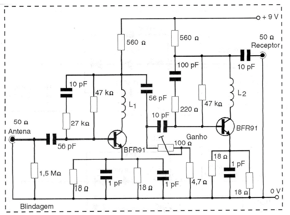 This circuit was found in a 1997 documentation. It works as a booster for VHF and UHF signals providing a gain of up to 30 dB. L1 and L2 are formed by 5 turns of AWG 22 wire in the form of 5 mm without core. 1 pF capacitors can be “made” with two pieces of wire of about 3 cm interlaced.