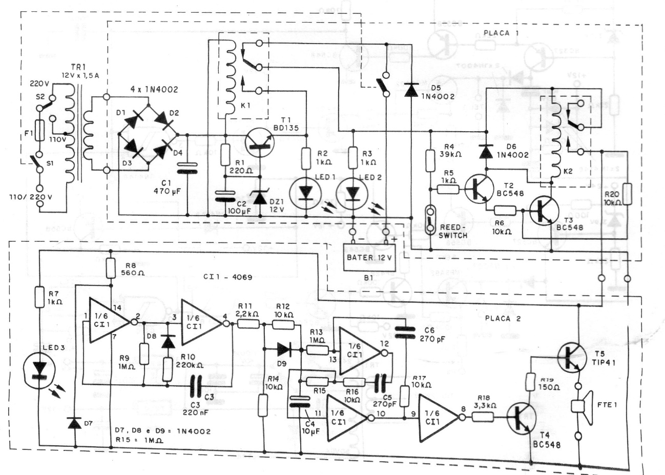 We found this sophisticated home alarm in a 1994 documentation. The circuit supports sensors of various types and has a battery that keeps it running in the event of a power failure. A powerful siren is also included.