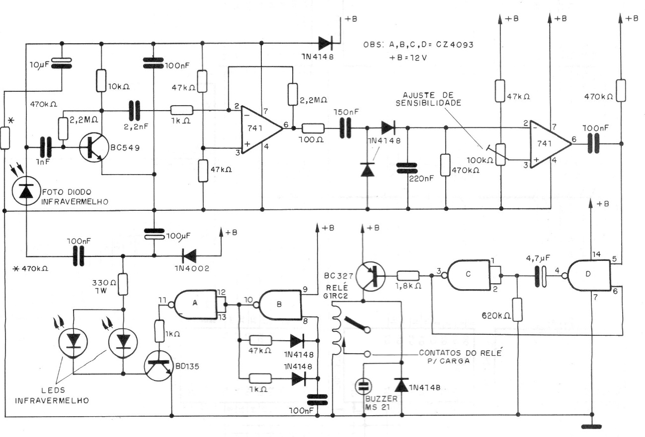 The emitter of this circuit from a 1995 publication is an infrared LED and the sensors are photodiodes that installed in tubes must point towards the area illuminated by the LED. The circuit activates a relay when a disturbance in the emitted infrared is detected. The sensitivity adjustment is made in the trimpot. The supply must be according to the relay.