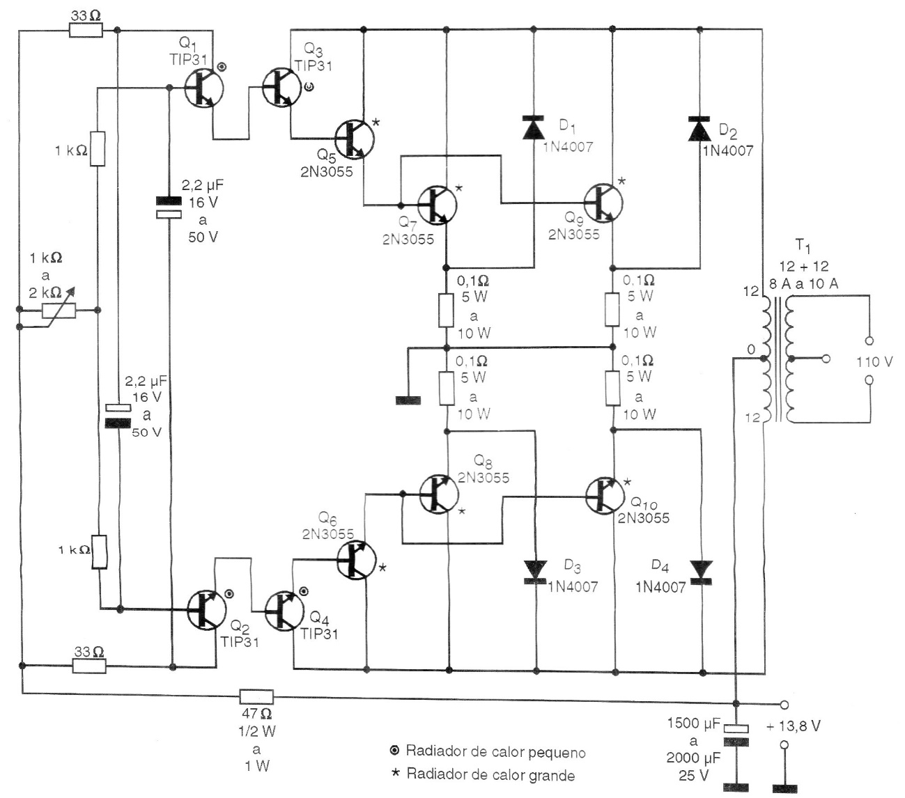 The critical component of this project from a 1988 publication is the transformer. The final power depends on it and if it is not well dimensioned beyond the loss of performance, we have heating. The transistors must be mounted on excellent heat sinks and the input current depends on the output power, being in the range of 8 to 10 A.