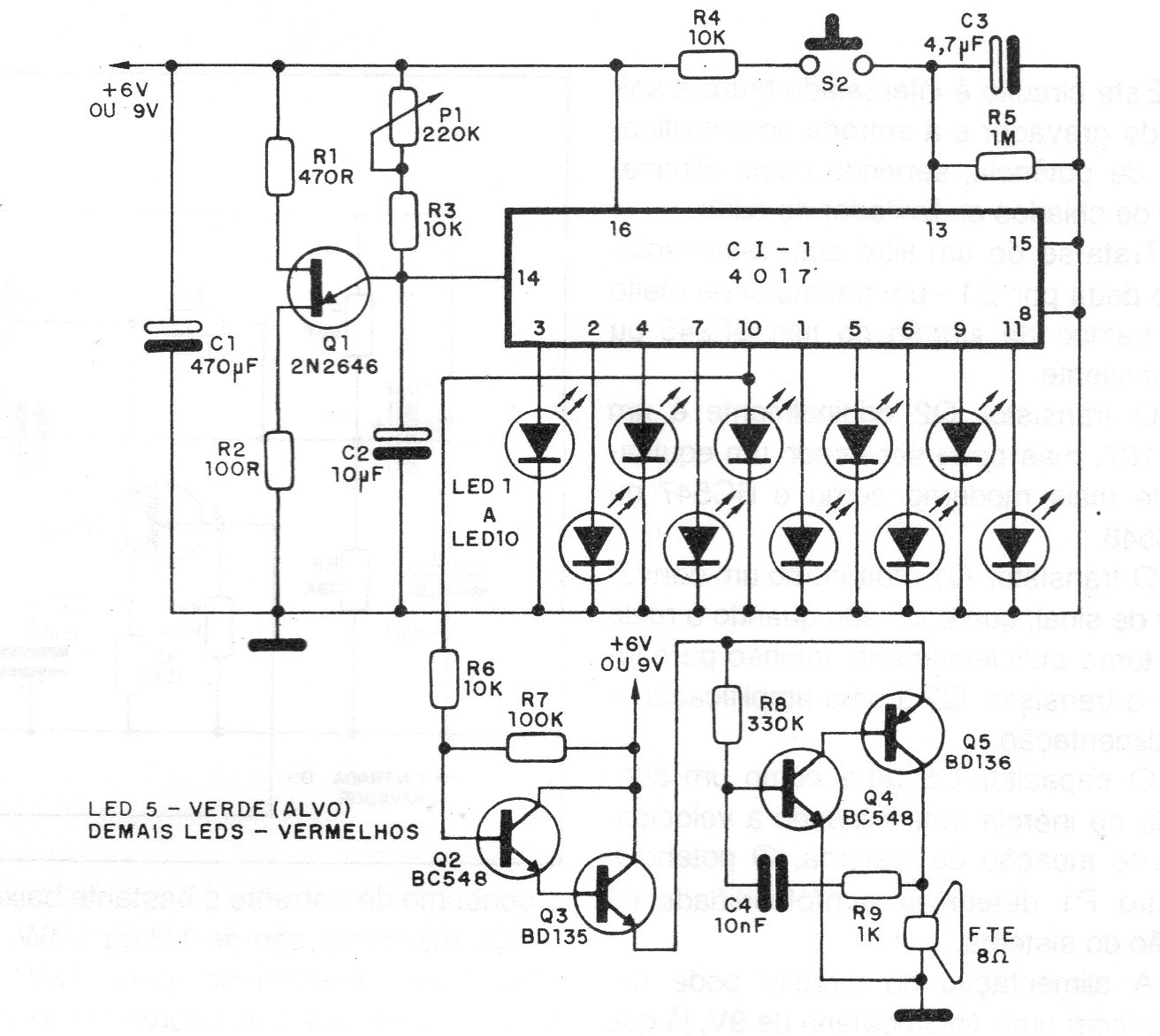 This circuit was found in a 1987 publication, but it can still be easily assembled today as the components are still common. The player must hit the target by pressing S2. The target's velocity is given by adjusting the potentiometer which can be 470 k as well. The power comes from batteries or battery.
