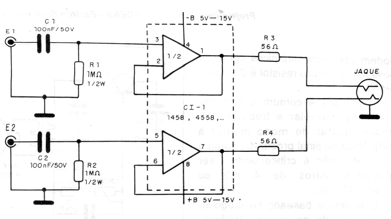The input impedance of the circuit shown in the figure is of the order of 1 M ohms and the output impedance of the order of 1 ohm only. The circuit requires a symmetrical source and can operate with signals ranging from 0 (DC) to 1 MHz).