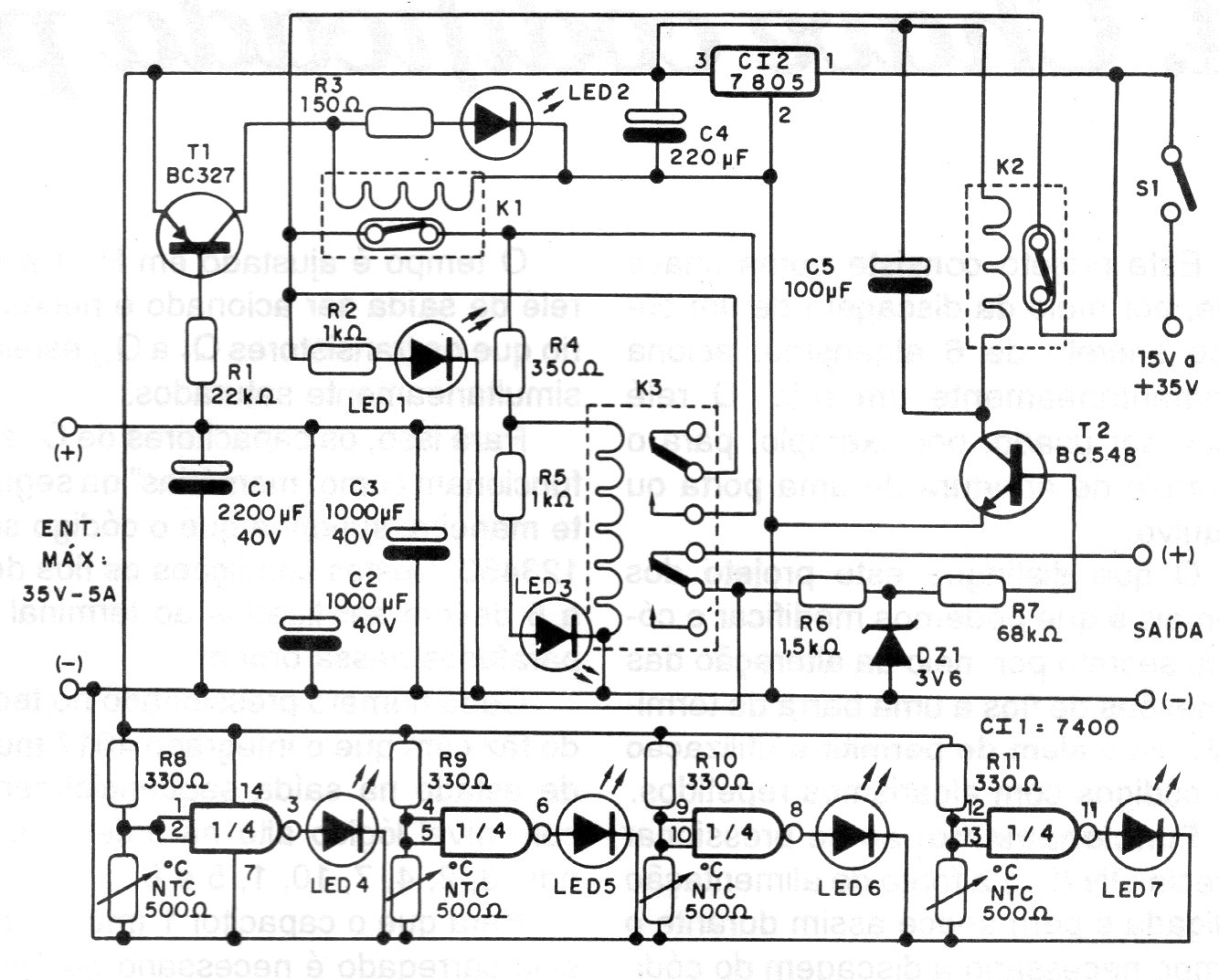 In the figure we have a protection circuit for sources that we find in a 1994 technical documentation. The circuit contains several LEDs for monitoring the functioning of the source. The LED indicates malfunction or short circuit. The temperature sensor is a 500 ohms NTC. The relays are 12 V with current according to the source.