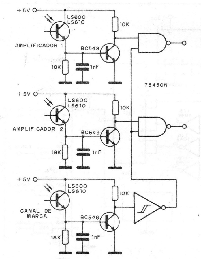 In this circuit, the transistors are NPN for general use and the phototransistors can be replaced by equivalents. The circuit is suggested by Texas Instruments for interfacing TTL circuits. The strobe signal comes through the brand channel.