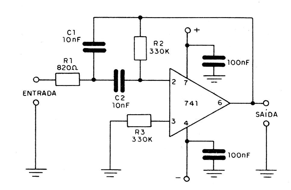 A second type of bandpass filter, which uses only an operational amplifier, is shown in the figure. This is a double feedback filter or, translating, a double feedback filter, where the components R1, C1 and R2, C2 determine the frequency range that it lets through. Again, in this case we also suggest components of commercial values that allow to obtain the pass frequency around 1 kHz. For an exact value, components with small tolerances should also be used. The source is symmetrical from 9 to 15 V and the operational input and output characteristics must be respected.