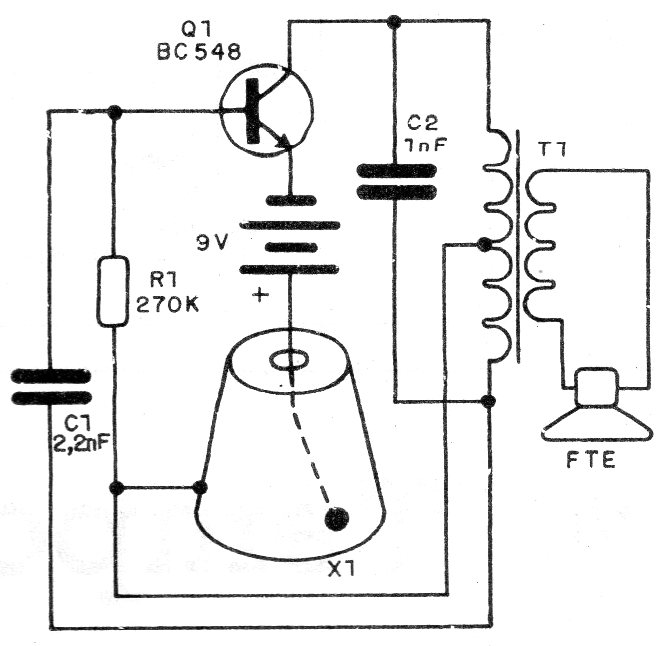 In reality, it is an audio oscillator that is triggered by a structure that forms a bell-shaped sensor. The speaker can be remote and there is no consumption when there is no sound. The circuit can be powered by two or four common batteries and the sound changed through the exchange of R1.