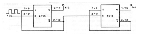 The cascade connection of two flip-flops allows division by 4, as shown in the figure. Note that the output for the second flip-flop is not removed from the Q outlet, but from its complementary outlet. The maximum frequency is in the order of 10 MHz and depends on the supply voltage, between 3 and 15 V.