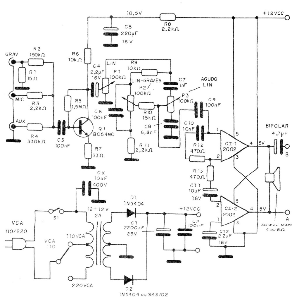 In the bridged configuration the TDA2002 amplifier can supply 30 W of power at a load of 4 ohms and slightly less at a load of 8 ohms. The circuit shown in the figure is from 1992 documentation and already includes the power supply. The power supply transformer must supply at least 2 A and the integrated circuits must be equipped with heat sinks. The circuit includes a pre-amplification stage, several inputs, and a tone control.