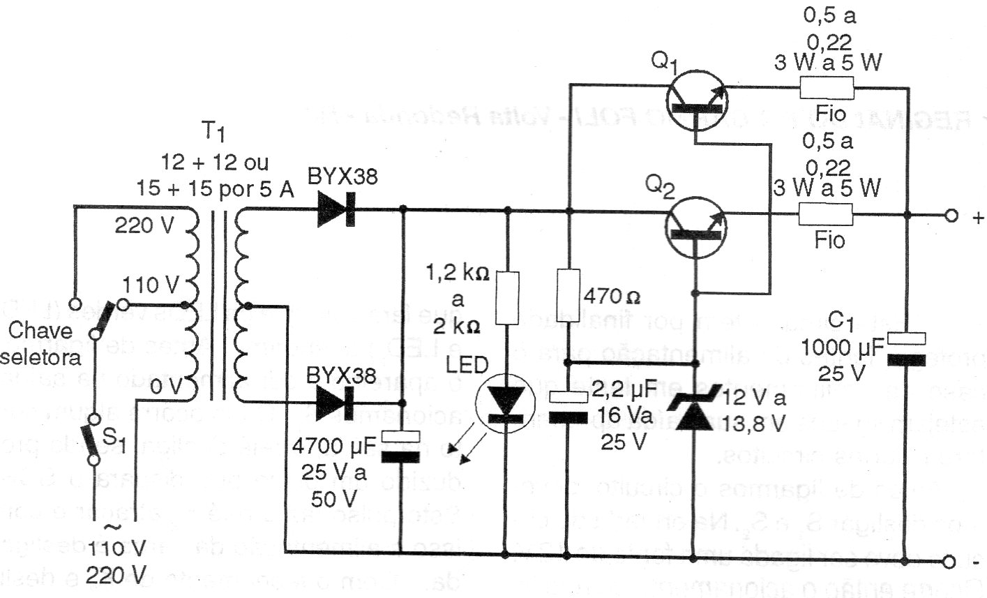 We found this conventional source with power transistors in a 1997 publication. The output voltage can be 12 or 13.6 V depending on the zener diode used. The power transistors must be mounted on good heat sinks and the transformer has a secondary current of 5 A. The transistors are type 2N3055.