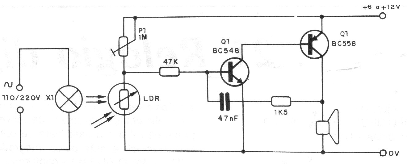This simple circuit does not use relays, directly activating an audio oscillator when the light falling on the LDR is cut off. The circuit can also be used as a light alarm and can be powered with voltages from 6 to 12 V. For voltages above 9 V use the BD136 for Q2 and provide it with a small heat sink.