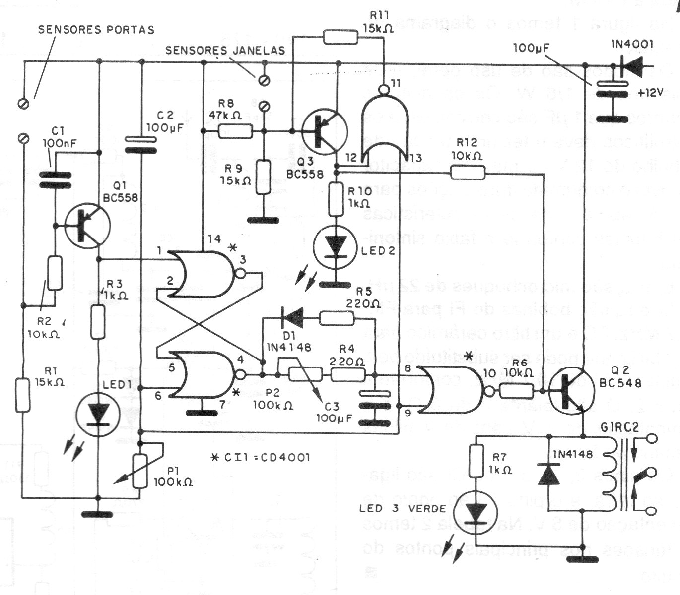 This is a conventional alarm that uses NO and NC type sensors for doors and windows. The circuit is from 1994 documentation using only one relay to control an alarm system. The circuit uses a battery source and via the network given in CB16777E.