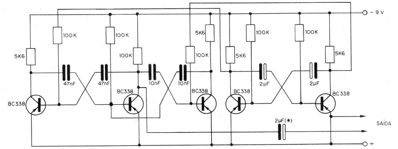 What is a dual frequency generator for? There are several possibilities of use for this circuit. The reader can use it as part of a different researcher-injector of signals, as part of an electronic musical instrument or, simply, to generate a different tone signal in an alarm. Of course, in these applications where the required signal level is higher, it will be necessary to use a power amplifier, externally. The circuit of this dual frequency generator is shown in the figure. As the reader can perceive, two interconnected astable multivibrators are used, with the use of a third interconnected transistor to obtain a different sound effect. The 47 nF, 10 nF and 2uF capacitors determine the signal frequencies that are around 150 Hz the first and 750 Hz the second. The reader used OC71 germanium transistors in the original design, but modern equivalents, such as the Bo338, can perfectly lead to the same practical results. In fact, even general purpose NPN transistors, such as BC237, BC238, BC547 or BC548, can be used, if the polarity of the power supply is reversed.