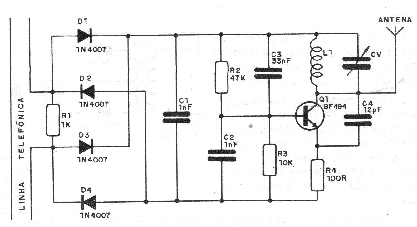 This wireless stapler transmits telephone conversations to an FM receiver at up to 50 meters. The coil consists of 4 coils of wire 28 or 26 in the form of 1 cm without core. The antenna must be 10 to 15 cm. The capacitors are all ceramic. The circuit is powered by the telephone line voltage itself.
