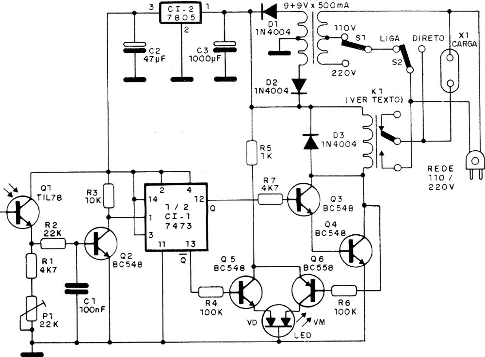 We found this interesting bistable photoelectric control circuit in a 1988 documentation. The circuit uses TTL technology and a 5 V supply is included. The circuit drives a relay and has two LED indicators. The adjustment of the trigger sensitivity is made in the trimpot.