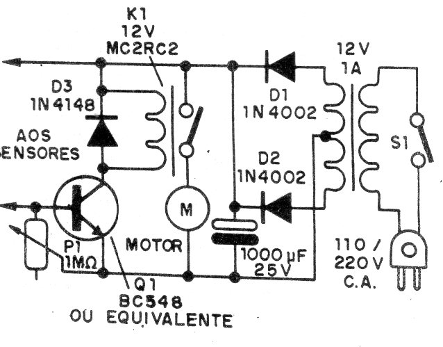 This circuit activates a water pump when the sensors detect lack of humidity in a vessel, for example. The circuit is powered by voltage according to the relay and the motor.
