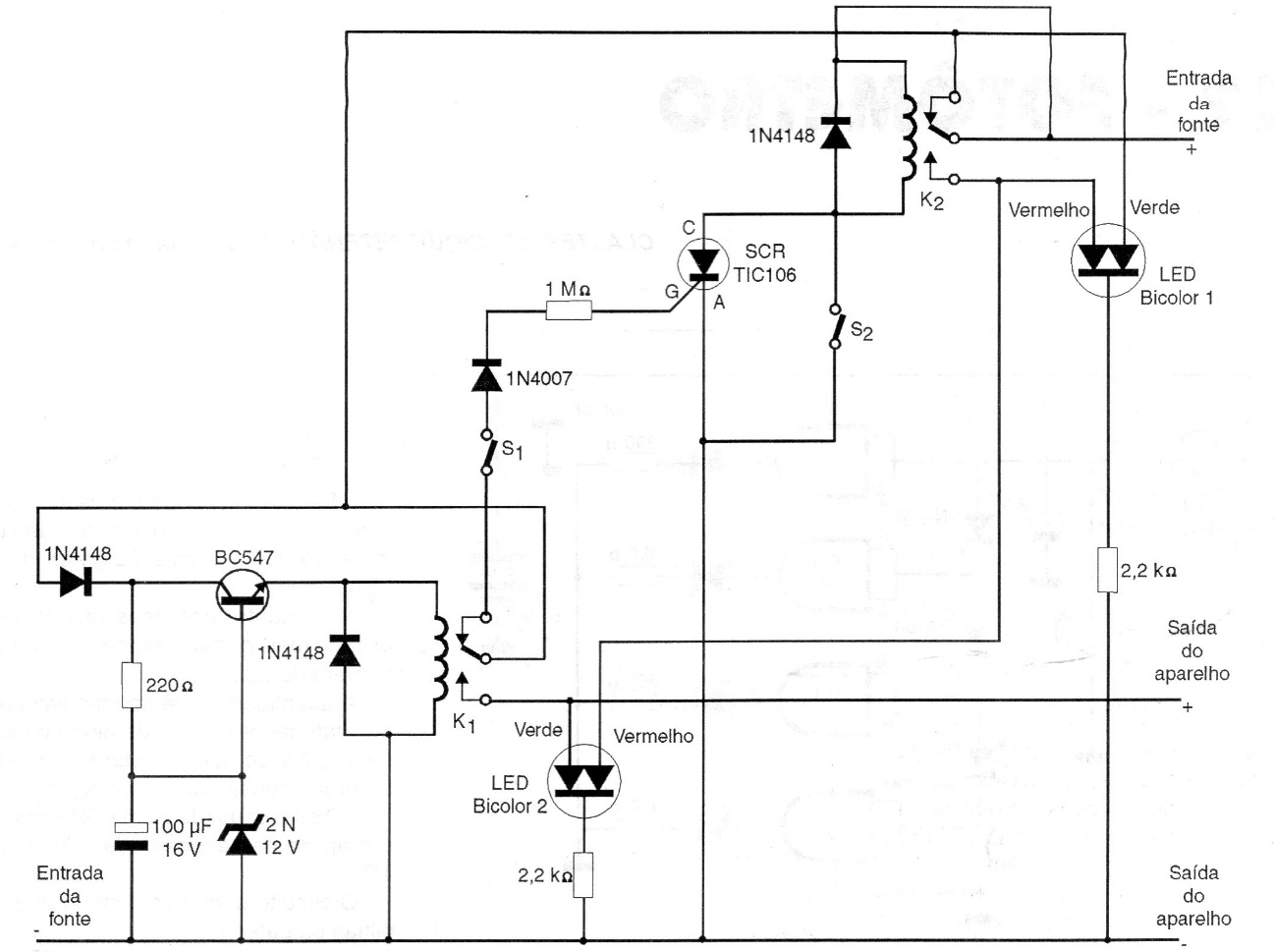 This circuit, found in a 1997 documentation, protects sources against shorts in their output. The circuit uses a sensor system that triggers an SCR in the event of a short by activating a relay that keeps the source off until the short is removed.