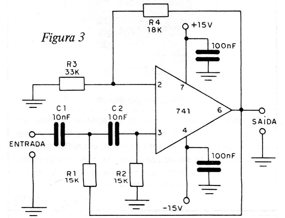 This filter operates in the “opposite” way to the previous one (CIR8814), cutting all signals whose frequencies are less than approximately 1 kHz. As we can see, the base is a single integrated circuit 741. As in the previous case, the suggested values are standard, so the cut does not occur exactly at the indicated frequency, but at a point that, for most practical applications, can be considered satisfactory. For cutting at the exact point, the reader must use components with small tolerances and values that are difficult to be obtained in our market. In this case too, it is the components R1, R2, C1 and C2 that determine the exact frequency at which the cut occurs. The filter must be supplied with a symmetrical source with voltages between 9 and 15 V, and the input and output characteristics of the operator must be respected. During assembly, all connections must be short, so that no instabilities or humming can occur.