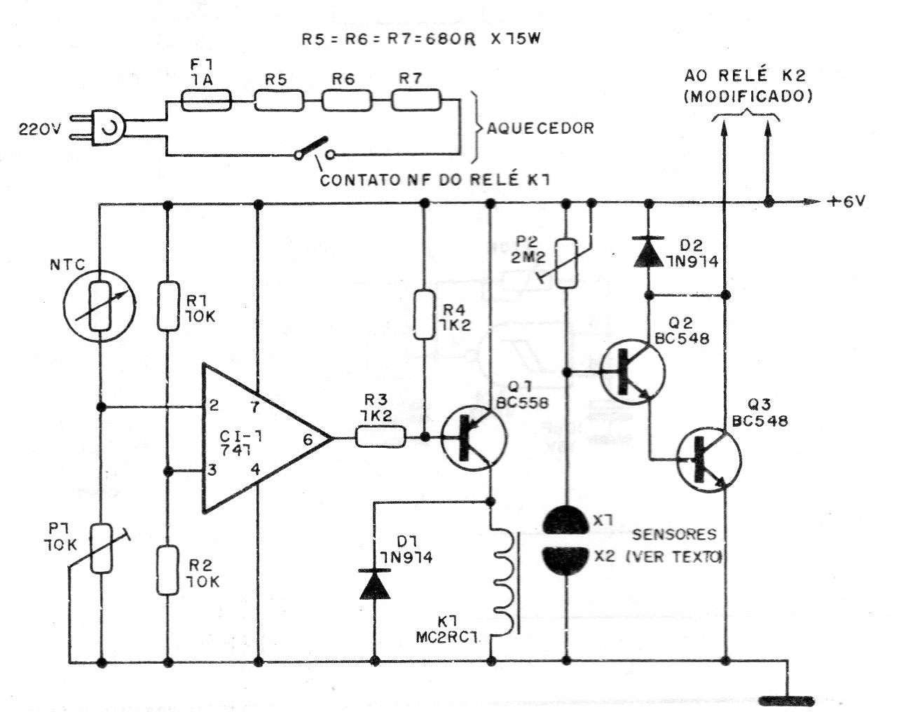 This circuit from a 1988 documentation uses an NTC sensor to keep a greenhouse temperature constant. The circuit controls a relay that is connected to the heating element and a solenoid to activate the water pump. The solenoid is obtained by modifying the relay. The supply depends on the voltage of the relay.
