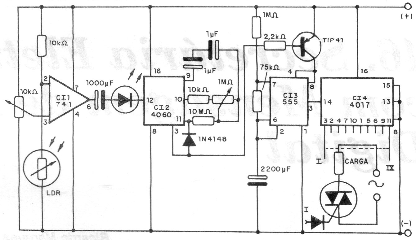 In fact, this circuit consists of a presence simulator for sites and farms that, after dark, activates appliances and lamps in the house in sequence, to give the impression that someone is in it. The devices are activated via triacs and the times adjusted in the trimpots next to the 4060. The sensitivity of the sensor is adjusted in the trimpot connected to the 741, The source must be isolated.