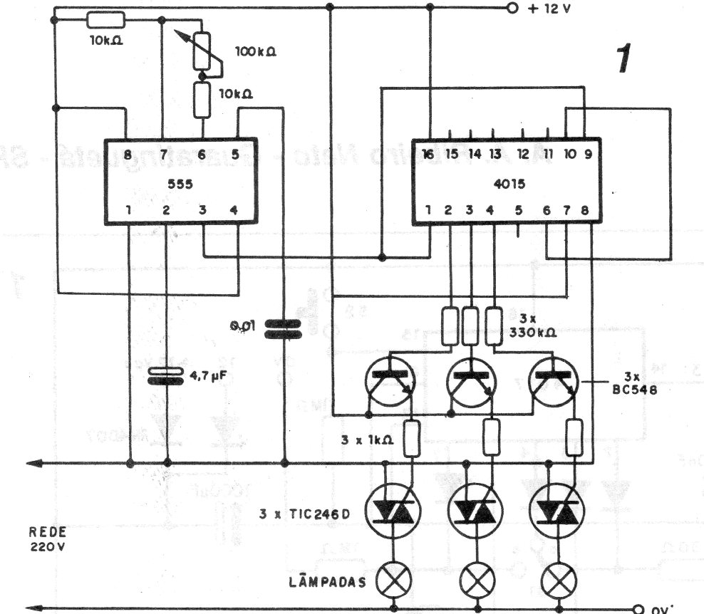 This 3-channel sequential circuit, but which can be expanded further, uses triacs to drive incandescent lamps. The circuit is from 1995 documentation. The speed of the effect is adjusted in the pot and the triacs must be mounted in heatsinks.
