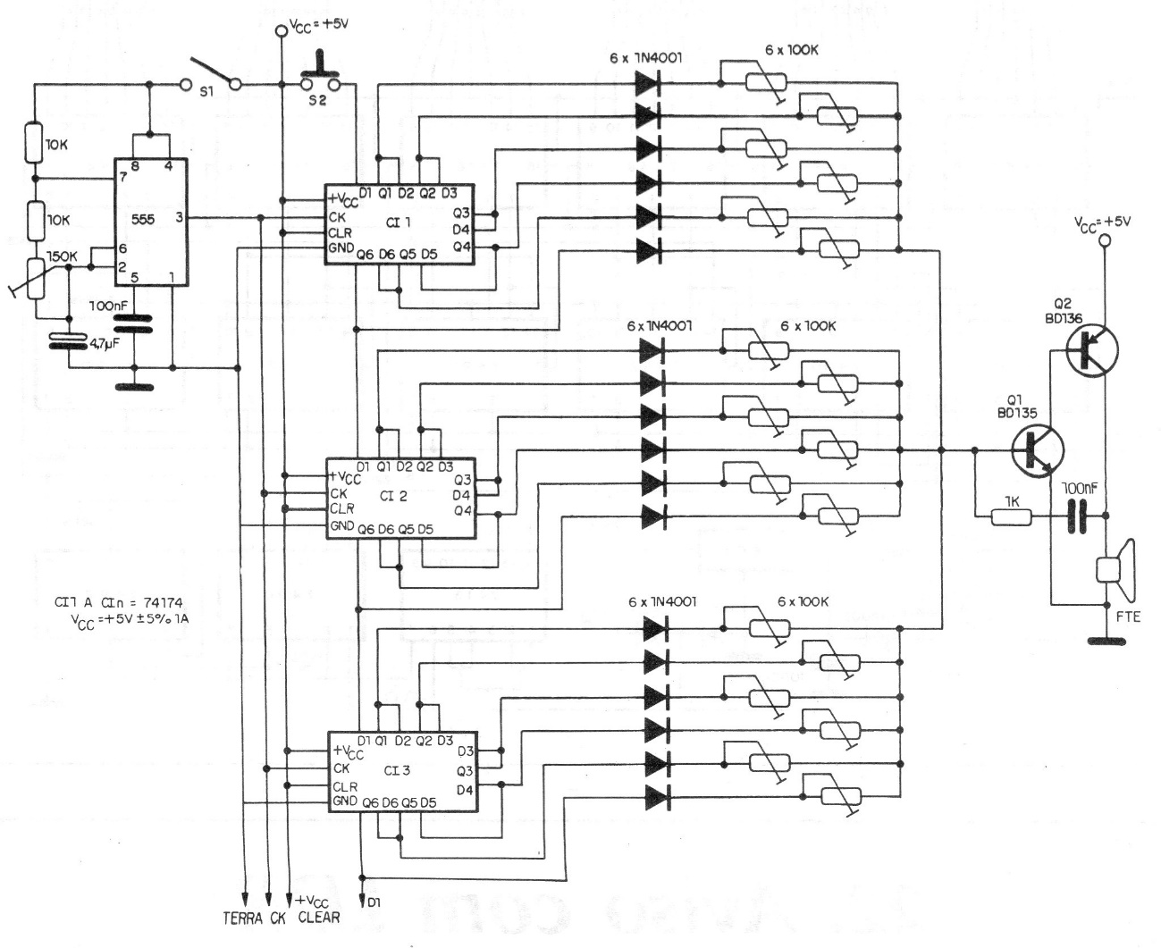 The note sequence for this circuit is achieved through integrated circuits controlled by the 555. The speed of the sequence is adjusted in the trimpot next to the 555 while the other trimpots adjust the emitted musical note. The circuit is from an old publication from the 70s.