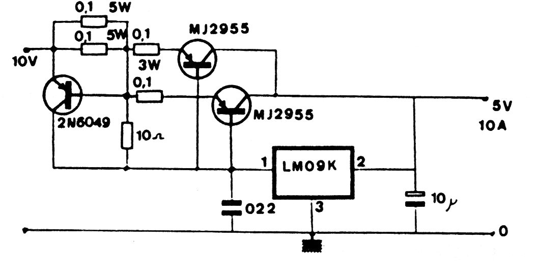 This high current regulator for TTL circuits was found in an old French documentation from the 70s. It appears in other versions on the website, coming from other sources. The power transistors must be equipped with heatsinks and the CI admits equivalent as the 7805.