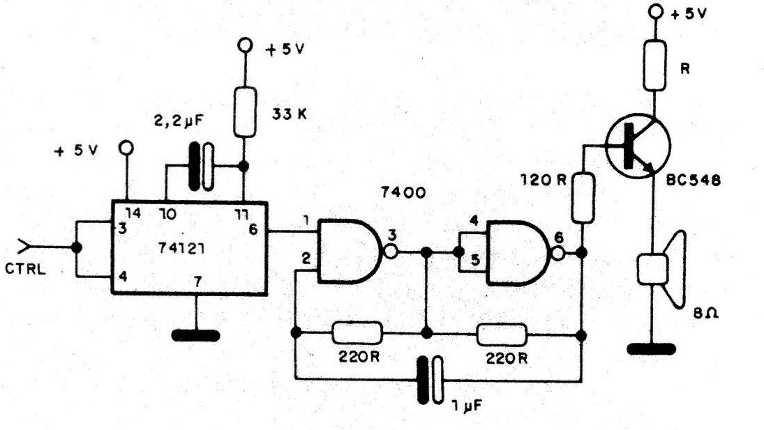 The presence of a pulse at the CTRL input produces an audio signal of duration determined by the 2.2 uF capacitor. This signal has the frequency given by the capacitor of 1 uF, which can be changed in the range of 220 nF to 2.2 uF. The R resistor in series with the BCS48 transistor determines the audio level, typically ranging from 47 to 220 ohms. The 7400 is powered by pins 14 and 7. Remember that the 74121 consists of a monostable, triggered externally by pins 3 and 4. The circuit can be used as a shield.