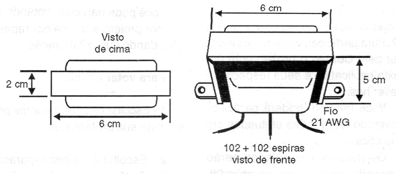 This approximately 100 W PMPO module was found in a technical publication in 1997. The circuit must use 2-ohm speakers and the T1 transformer has a low impedance (or low voltage) and secondary winding of approximately 600 ohms. T2 has 102 + 102 turns of wire 21 in a transformer core with the dimensions indicated in the figure. Output transistors must be mounted on heatsinks. The current drained by the circuit is of the order of 7 A.