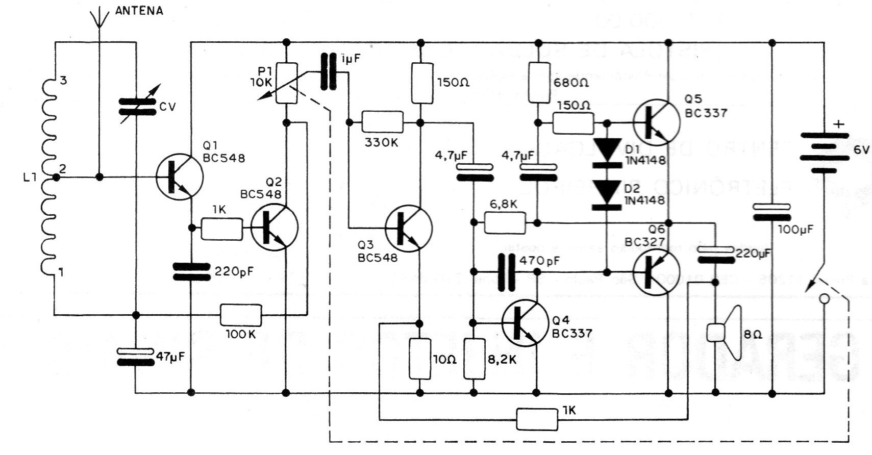 The high number of transistors on this radio for the medium wave range is an indication of its sensitivity and sound quality. However, even though it has a lot of transistors and a good gain, it is still a simple radio in the sense that no special adjustments are required for its startup, nor even special components. The author of this project made a "fusion" of radios that we have already published on the website. The complete circuit is shown in the figure. As we can see, we have a detector and amplifier stage formed by transistors Q1 and Q2. The signal from this stage is taken to the high-quality audio amplifier, formed by the other transistors. P1 works as a volume control. For stronger local stations, it will not be necessary to use an antenna. For weaker or more distant stations, you will need an antenna that can vary from a 2 or 3-meter piece of wire extended behind the radio, to an external antenna in extreme conditions. The circuit is powered with a voltage of 6 V, coming from 4 small batteries. The L1 coil can be of the commercial type for medium waves, as well as the variable capacitor. Readers who want can try a "home-made" coil that consists of 80 coils of enameled wire 28, on a ferrite rod 1 cm in diameter by 10 to 15 cm long. This coil has a tap on the twentieth turn.