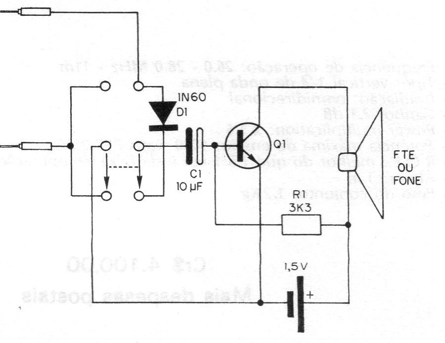 This simple circuit allows the monitoring of both audio and RF signals. With the switch in one position, we have the direct passage of the audio signals to the base of the amplifier transistor (via electrolytic capacitor) and with the switch in the other position, we connect a detector diode to monitor RF signals. The Q1 transistor, which acts as an amplifier, can be of any NPN type for general use, such as the BC547, and the transducer can be either a low impedance headset or a speaker, although the use of headphones high impedance or light output transformer for better results.