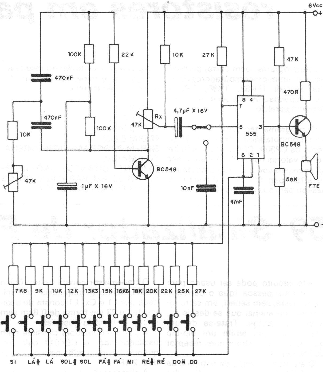 We found this circuit in a 1987 magazine, but the use of still common components allows its assembly even today. The circuit has 12 notes and an amplifier stage for the sounds feeding a small speaker. The tuning depends on the accuracy of the resistors that can eventually be replaced by trimpots. The power can be done by source or batteries.