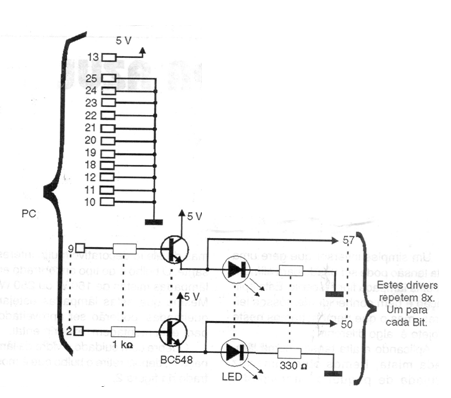 If the reader has an old PC that still uses a parallel port and wants to use it in his control and automation projects, the shield that we present below is very simple. This low power circuit for currents up to 100 mA allows relays to be driven, but higher current transistors such as the BD135 can be used to directly drive loads up to 500 mA. The circuit was found in a 1997 documentation.
