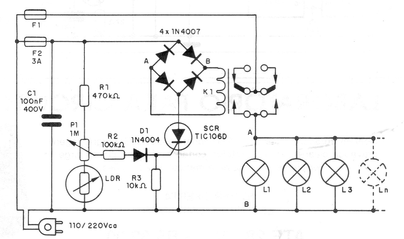 This circuit, which has a very common configuration, was obtained in a 1994 documentation. It can be used with ordinary lamps and other types that light up when the sensor stops detecting light. The trigger point is adjusted in P1. As the control is made by 110 V or 220 V relay, any type of lamp can be controlled.