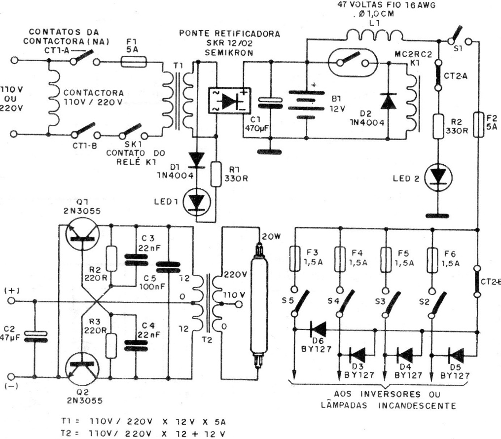 This 1988 documentation circuit includes a charger and an inverter to power a small fluorescent lamp. The components used are still common in our market and the power transistors must be mounted on heat sinks. The power transformer is 12 V x 500mA to 1 A.