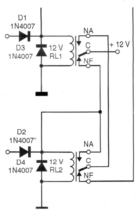We found this circuit in a 1998 documentation. The circuit can be made with 12 V, 6 V or even 5 V relays, being the choice according to the power supply. The flip-flop is of the R-S type with inputs at the relay voltage level. Equivalent diodes can be used.
