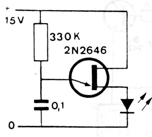 This ultra-low power circuit makes the LED flash. The circuit is powered by 15 V in this application, but must operate from 6 V.