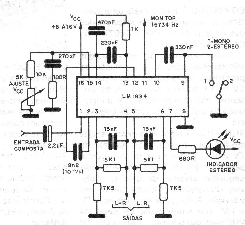 This circuit, suggested by National Semiconductor, decodes audio signals from stereo TV broadcasts. Note that the frequency of the pilot signal is 15 734 kHz, different from the 19 kHz used in stereo FM broadcasts. The adjustment of the "capture" by the VCO frequency is done in the 5k potentiometer or trimpot (4k7). The supply is made with voltages in the range of 16 to 18 V. The capacitors must be of good quality, with special attention to the connection between pins 2 and 12, which must be 10 ° / o of tolerance. The resistor in series with the adjustment pot or trimpot must be made of metal film with a zero-temperature coefficient. The L + R and L-R outputs can be played directly on the input of an audio amplifier.