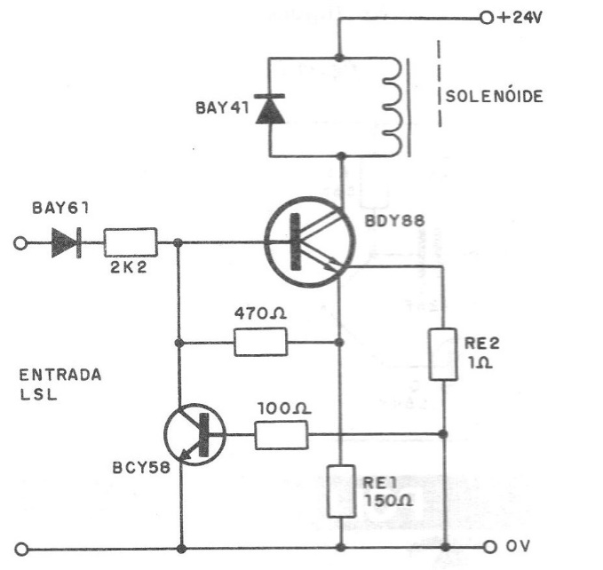 This circuit, suggested by Siemens, allows the activation of 24 V solenoids from TTL LSL signals, being, therefore, ideal for interface designs or shields for industrial robot controls or process controls from microcomputers. As we can see, in the power stage a Darlington Siemens BDY88 is used, which controls the main current of the solenoid, which can have a maximum of around 1A to 24 V. The BCY58 transistor serves as protection against short-circuit, limiting the current solenoid to safe values. The solenoid must have a coil resistance of 56 ohms and a reactance of 56 ohms. Dissipation in the short circuit condition is given by: