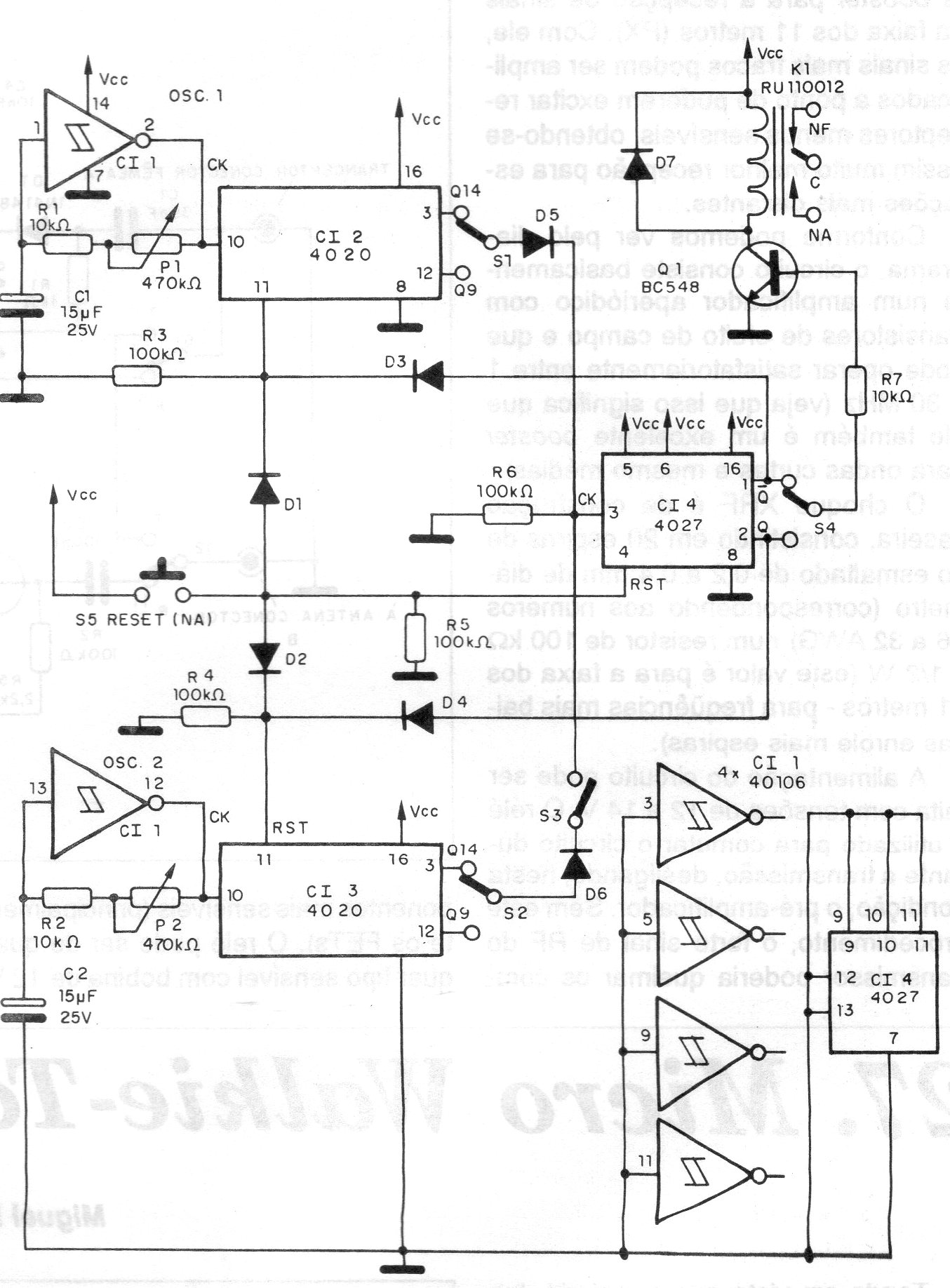 We found this digital timer circuit in a 1994 publication. The power is supplied by 12 V, which is the voltage of the relay. The 4027 power pinout was not shown in the diagram. The time adjustment is done in the potentiometers.