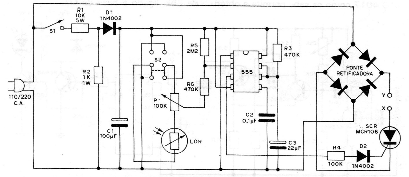 The photocontrol that we give in this project of a 1982 documentation allows to activate a circuit for a determined time, both by the incidence of a beam of light on a sensitive element and by its cut, according to the position of S2. You can use this circuit as a light alarm (incidence or cut), as a remote control for opening garage doors by the car's headlight, and in many other interesting applications. The use of a diode bridge in the load circuit allows to obtain full power in the load, which cannot be achieved simply with an SCR.