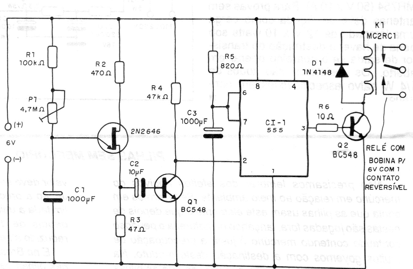 This circuit opens and closes the contacts of a relay at regulating intervals determined by the setting of P1. These intervals can go up to 1 hour with the components used and even more with the increase of the electrolytic capacitor. The supply is made with 6 V for relays with this voltage, but we can also use 12 V relays supplying the circuit with 12 V.